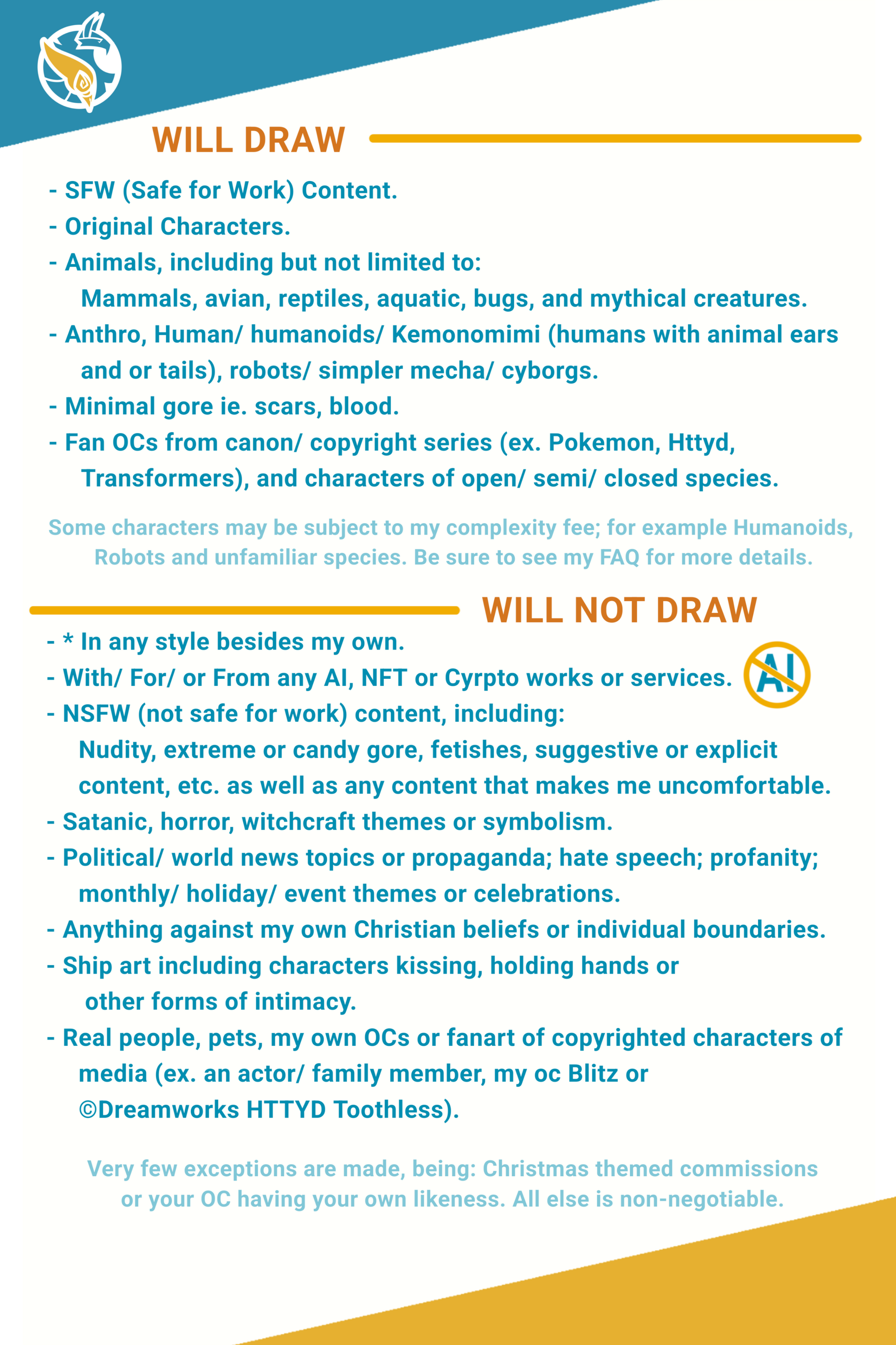 | 42a] [ WILL DRAW ] - Original characters including, but not limited to: Animals, Anthros, Human/ oids, robots/ simple mecha - Fan Original characters (ex. Transformers, Genshin Impact, HTTYD), or Original Characters of open/ semi/ closed species - **For Traditional requests/ character cards, I can draw some fanart (Genshin Impact) - Minor gore ie. Scars/ blood - SFW CONTENT STRICTLY 42b] [ WILL NOT DRAW ] - NSFW of any level or theme - Political/ world news; Hate speech; monthly/ holiday/ event themes or celebrations; against my own Christian beliefs or individual boundaries; ship art; and real people. - Satanic, horror, witchcraft etc. themes or symbolism, as well as profanity. |